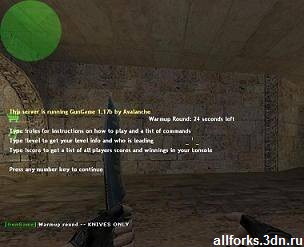 GunGame мод - очень схож с DeathMatch и является его модификацией. Отличием от стандартного DeathMatch мода стало то, что в "GunGame" отсутствует возможность выбора оружия, игроку приходится набирать очки для того, чтобы получить более мощное. В этом моде используются специальные небольшие карты, и поэтому отсутствуют снайперские винтовки. |